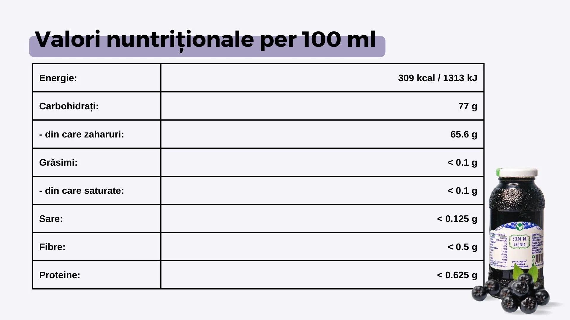 Siropul de aronia, obținut din suc natural bio de aronia, zahăr și acid citric din fructe, este o sursă excelentă de antioxidanți și vitamine esențiale. Aronia contribuie la întărirea sistemului imunitar, susține sănătatea inimii și ajută la protecția celulelor împotriva stresului oxidativ. Poți folosi siropul în apă plată sau minerală pentru o băutură răcoritoare, sau ca topping pentru deserturi, iaurt sau clătite. Ideal pentru un boost de sănătate și savoare în orice moment al zilei!